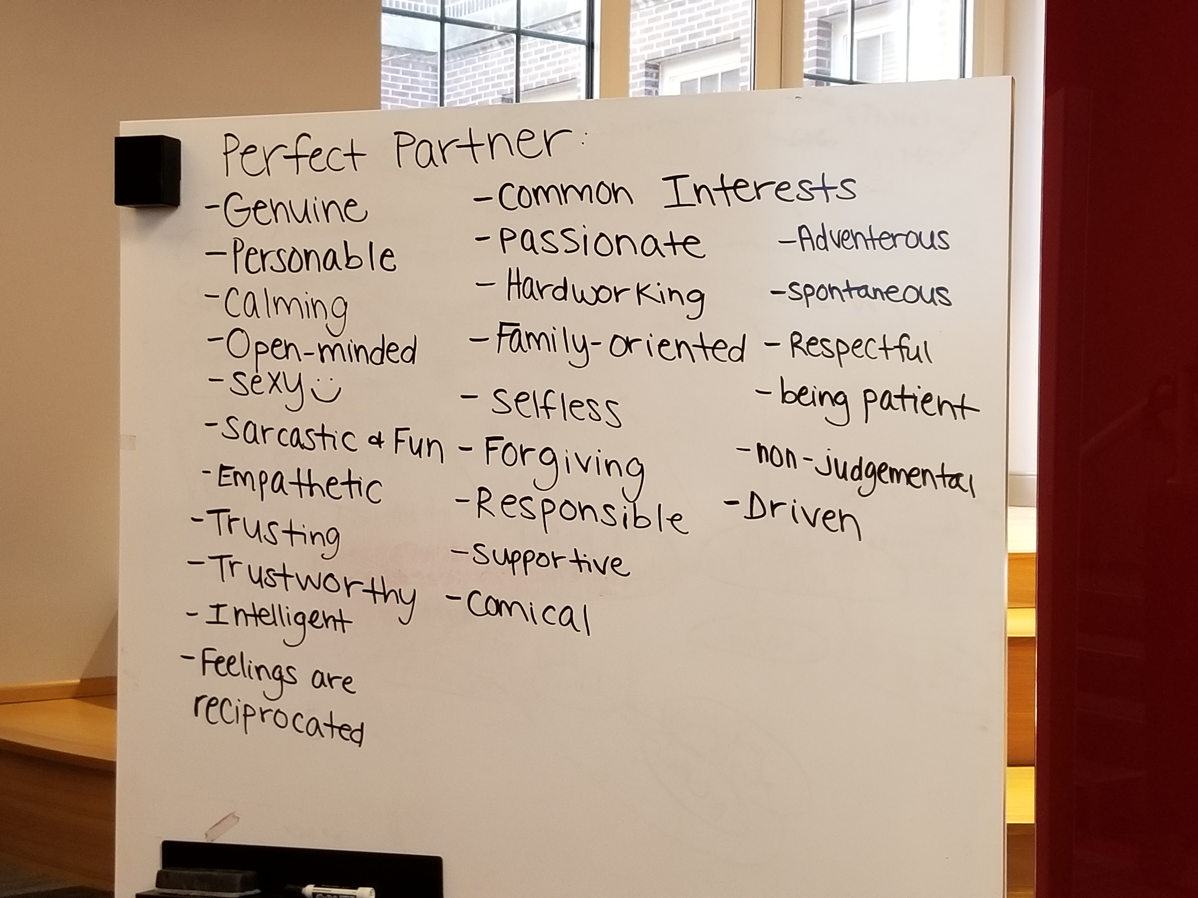 Next, I have them take five minutes to write down the characteristics of their perfect partners. Then, in small groups, I have them grab a large post-it note or use one of the freestanding dry erase boards in my classroom and some markers, and, in a small group, “Discuss your perfect partner with your group – what were the commonalities in what you were looking for? Write the commonalities on your large post-it note.” The list is always really extensive. I also ask them to take a picture of their post-it note and post it to their “group” page in Canvas. They could also just save it on their phone for next week.