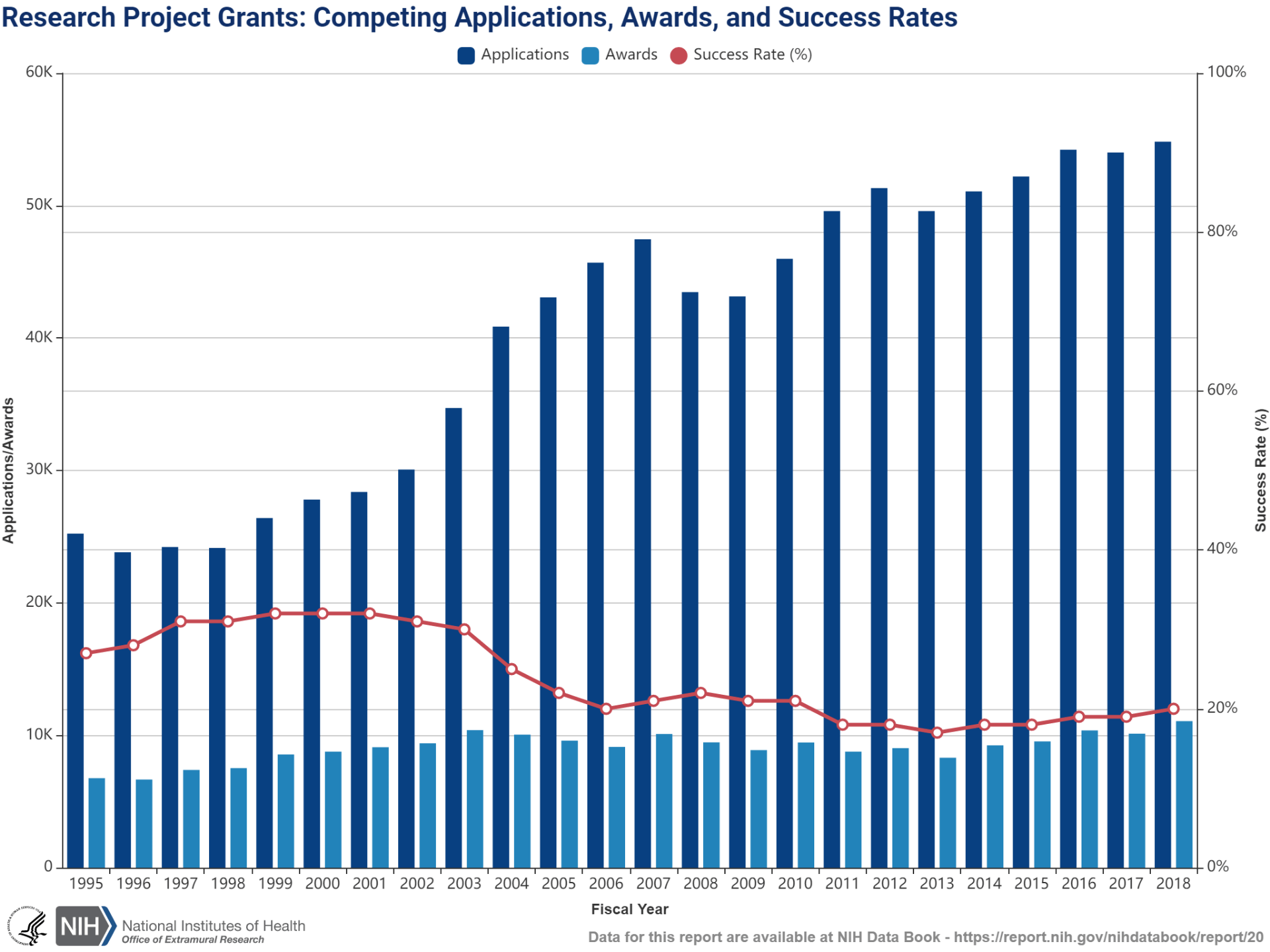 The number of submissions to the National Institutes of Health has grown continually over the past 20+ years; in 2018, NIH received more than 55,000 grant applications, of which about 20% were funded, though the success rate varies by NIH institute.