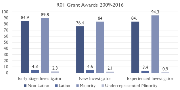 Thus, about 70% of R01-equivalent (NIH’s main grant mechanism for large research projects) are awarded to men. I tried to find the numbers broken down by race/ethnicity in NIH’s Data Book, but the numbers were not available. Nikaj, Roychowdhury, Lund, Matthews, and Pearson (2018) examined R01 grant awards between 2009 and 2016. They found that less than 5% of awardees identified as underrepresented race or ethnic minorities.